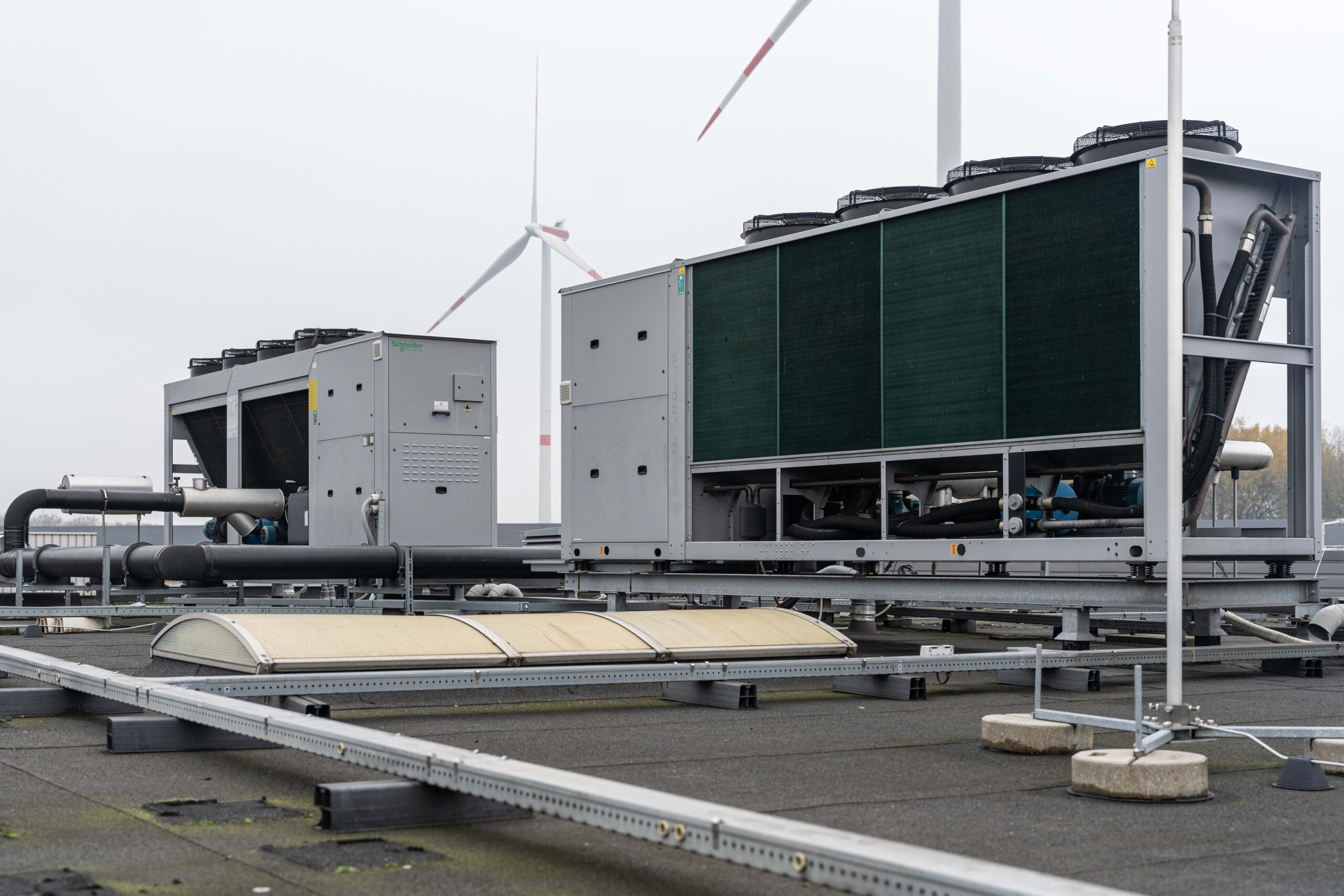 Vanaf 2016 zijn wij met de klant om tafel gegaan voor advies over de beste vervolgstappen. In ons ontwerp hebben we gekozen voor een volwaardige CW-installatie (Chilled Water, oftewel koudwater) met 3 koelmachines met een capaciteit van 200 kW per stuk. Dit is een N+1-oplossing: ook als 1 van de koelmachines uitvalt, bieden de andere 2 nog voldoende koelcapaciteit om de volledige warmtelast uit de datazalen weg te koelen. Bovendien gaat het om FC-machines (Free Cooling, oftewel vrije koeling) die zoveel mogelijk gebruik maken van koele buitenlucht.