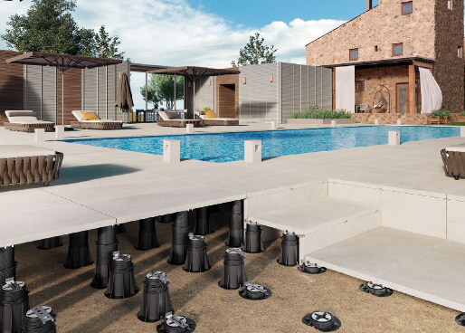 De panelen kunnen zowel binnen als buiten gebruikt worden, dus een vloer die vanuit de woonkamer tot rondom het zwembad in de tuin doorloopt behoort ineens tot de mogelijkheden. Het hoogte verschil wordt door de steunen vereffend.